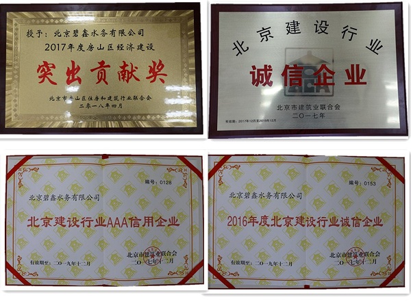 4月12日,在房山区住房和建筑行业联合会召开的第五届一次会员代表大会上,碧鑫水务荣膺北京市“北京建设行业诚信企业”、“北京建设行业AAA信用企业”和房山区“2017年房山区经济建设突出贡献奖”称号。